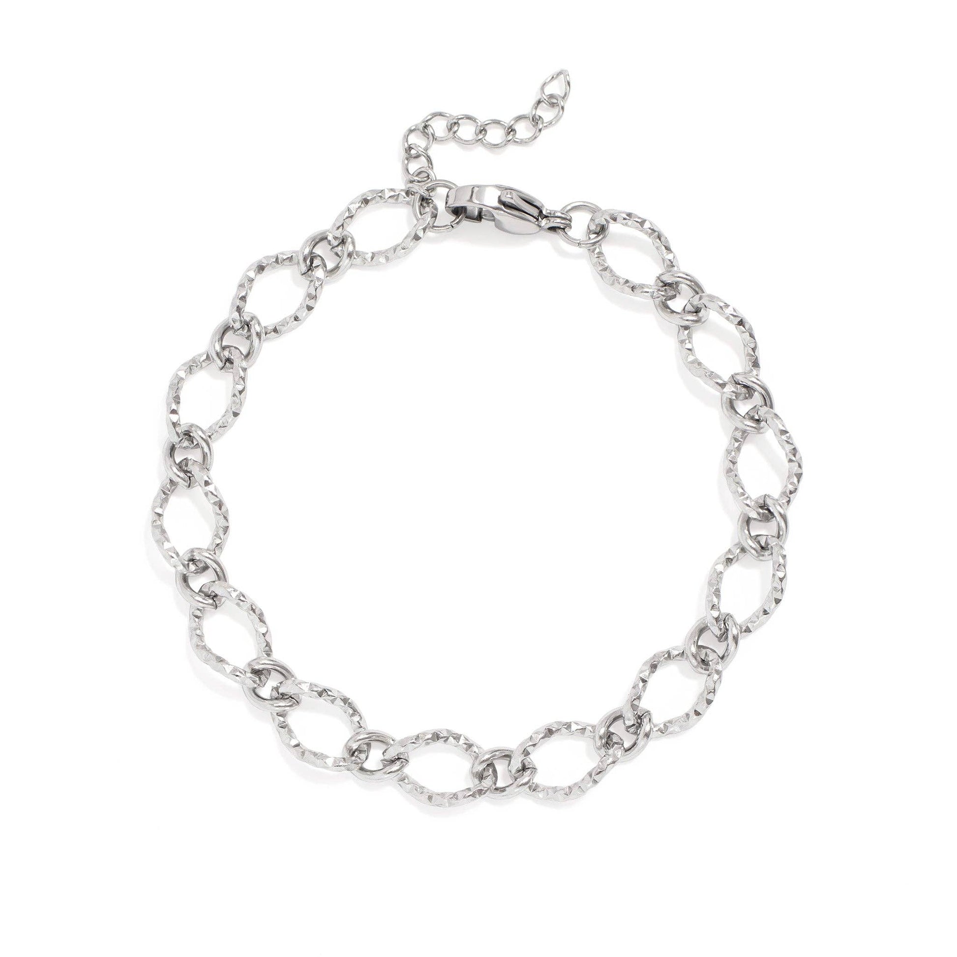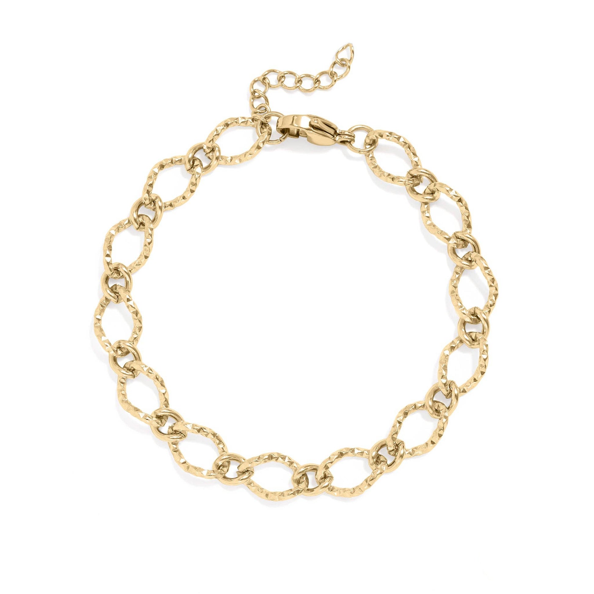 Make a bold yet refined statement with this hammered oval bracelet. Crafted from durable stainless steel and finished with a radiant 18K gold PVD finish, it features a textured oval centre piece that catches the light from every angle.